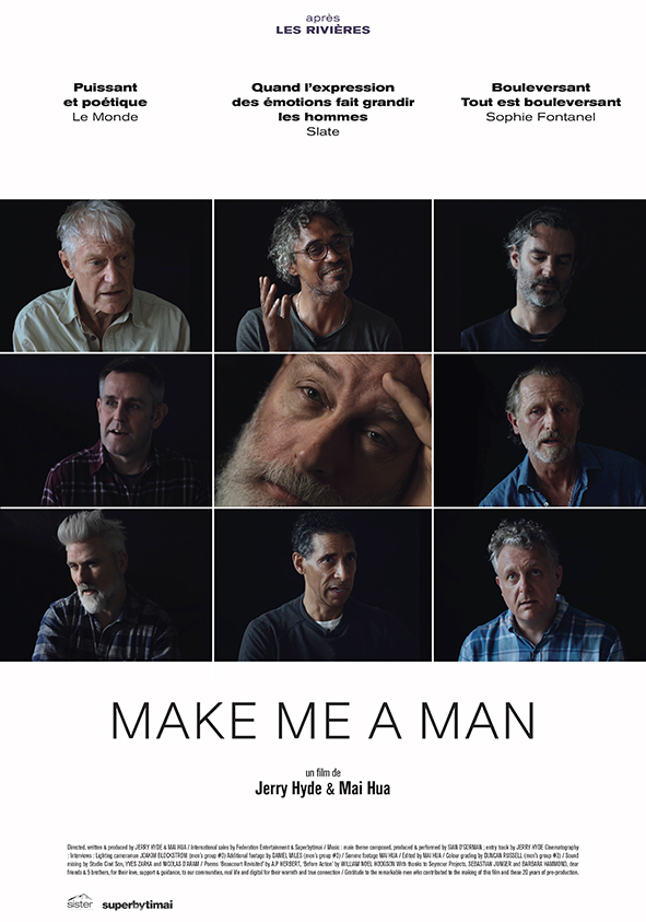 Après Les Rivières, le nouveau film de Mai Hua. Pour une heure seulement, vous êtes invité.e à rejoindre un cercle d’hommes. Make Me A Man pénètre au cœur du processus thérapeutique d’hommes, qui ont choisi de vivre une vie de réflexion, d’évolution et de soutien. Découvrez des échanges profondément intimes, et rejoignez Jerry et quelques uns des membres de ses groupes sur un pèlerinage puissant dans la Somme, sur les sites de commémoration de la 1ere Guerre Mondiale. Drôle, tragique, poignant et surtout viscéralement honnête, chaque participant s’ouvre d’une manière brute, précieuse. Jamais vue. A travers ces hommes, choisis dans les cercles de Jerry, parfois anciens de plus de 25 ans, le film explore des thèmes universels comme le sexe, la violence, les relations et ce qu’être un humain au 21e siècle veut dire.